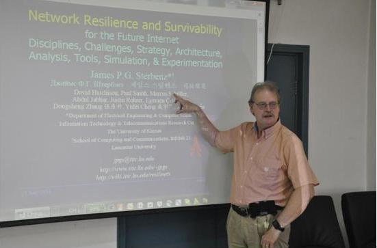 7月25日下午,美国堪萨斯大学的James Sterbenz 教授以“未来弹性网络”为主题,在实验教学楼4层会议室作了一场精彩生动的讲座。讲座由计算机与网络中心颜金尧教授主持。计算机与网络中心、理工学部的相关老师与博士生、研究生听取了报告并进行了深入交流。