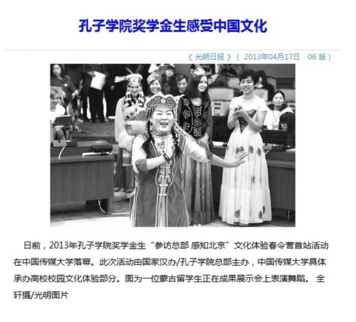 4月14日,由国家汉办/孔子学院总部主办,我校对外汉语教育学院承办的各国孔子学院奖学金生“参访总部、感知北京”文化体验活动在我校圆满落幕。4月17日出版的《光明日报》在教科新闻版面图文报道了活动盛况。中央电视台4月18日在法语新闻节目中也对该活动进行了报道。