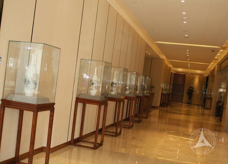 由叶建新教授为建校六十周年创作的60件陶瓷艺术作品,器型用叶建新教授最新设计的“净瓶”器型做胎,喷白釉,白釉上彩绘《校园四季图》长卷中校园风光,绘画内容顶部题书法创作该画作内容的平白叙或诗词赋并落款。