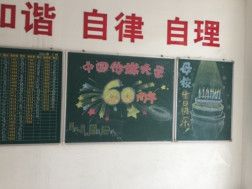 另外,各公寓楼的黑板报也以校庆为主题进行了更新,并在校内、中蓝和梆子井学生公寓悬挂了“我们的母校60岁了,祝母校生日快乐”的横幅,为学生公寓区域营造了隆重热烈的节目氛围。