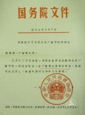 1963年5月24日,国务院下达《关于恢复北京广播学院的通知》(国文办字367号文件),同意恢复北京广播学院。《通知》还指出:该院恢复后,还归中央广播事业局领导管理,规模定为500人,设置外语专业和中文专修科。