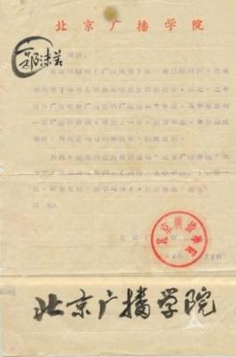 1964 年,北京广播学院编印的《广播稿选》第一集出版。这本书选集了中华人民共和国成立以前延安、陕北、北平新华广播电台广播过的广播稿四十多篇。其中有人大常委会副委员长、中国文联主席的郭沫若先生的一篇演讲稿。在编辑此书时,郭沫若先生提供了很多帮助和指示。为了表示感谢,学院特赠书一册以表纪念,同时还请郭沫若先生为学院题写北京广播学院六个字,做横匾用。11 月 11 日,郭沫若在回信中为北京广播学院题写了校名,成为学院的珍贵纪念。