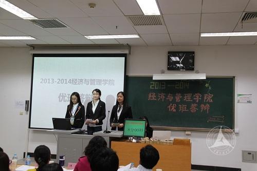 10月17日晚,经济与管理学院2013-2014学年优秀班集体答辩会在48教A803教室举行。学院副院长李珍晖、党委副书记毛建国、工商管理系主任孟庆顺、公共管理系主任林振宇、管理科学与工程系主任孙江华、经济系副主任程静薇、辅导员及三位学生代表担任此次大会评委,14级全体班委参与答辩会。参加答辩的9个班级带来了精彩难忘的班级建设成果展示。