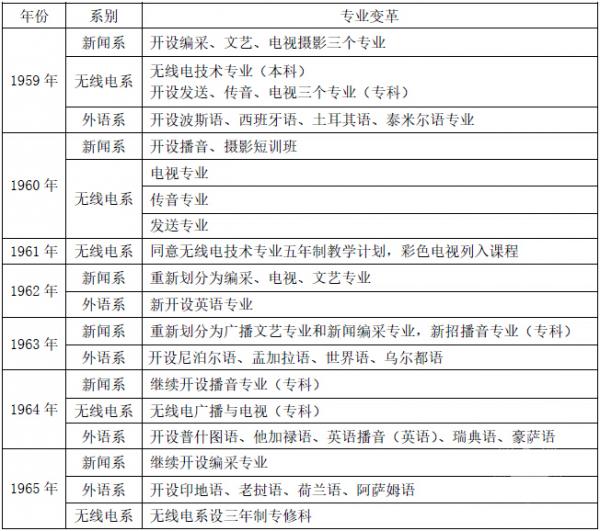北京广播学院 1959 年至 1965 年阶段招生专业设置变革一览表