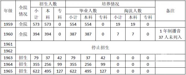 北京广播学院1959年开始招生,招生人数取决于广播系统的需求和国家经济形势的变化,所以所设专业和招生人数经常变化。1961年、1962年两年因国家经济困难而停止招生,