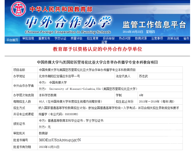 由国际传媒教育学院(ICUC)申报的我校与美国密苏里大学新闻学院合作举办传播学专业本科(教育部批准书编号:MOE11US2A20141597N)近日喜获得教育部批准。国际传媒教育学院依托传媒高等教育国际联盟的优质国际教育资源,建设国际化现代传媒综合学科体系,此次与美国新闻学排名第一的密苏里大学新闻学院联合开设本科学位,将系统引进密苏里大学新闻学院的优质新闻传播教育资源。这是学院建设国际化传媒高等教育教学改革的实验基地和中外合作办学的示范机构的又一重要阶段,也是国际传媒教育学院在我校“新闻传播学”保一工程的重点国际合作之一。