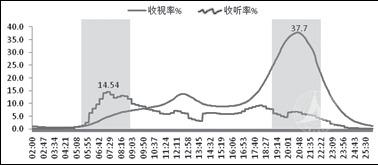 就数值而言,收听率小于收视率;就各自两个高峰间的差距而言,仍是收听率小于收视率,这一方面体现了广播和电视之间的竞争关系,两者对受众吸引力的不同,导致受众对两种媒介需求的不同;另一方面也反映了听众/观众在生活出行、作息规律方面的差别,并投射到其媒介行为中。广播以适时动态的听觉传播见长,不少受众是在伴随着主任务的完成中收听广播,被附加的主行为变化不大,习惯性较强,一天中变化相对平缓;而电视在以视听多手段传播各种信息的同时,已经成为人们寻求娱乐放松的最主要媒体,偏好性较强,人们结束一天工作后容易在晚间时段集中收视。
