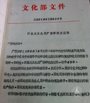 1985年 5 月 24日,经文化部批准,北京广播学院出版社成立,社号 450,是改革开放后最早成立的大学出版社之一。其上级主管单位为北京广播学院,业务上受国家教育部社科司和国家新闻出版总署指导。