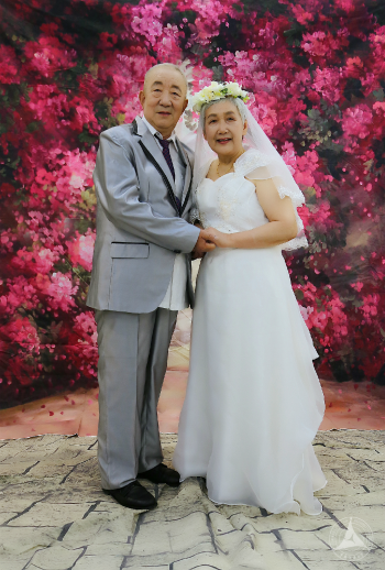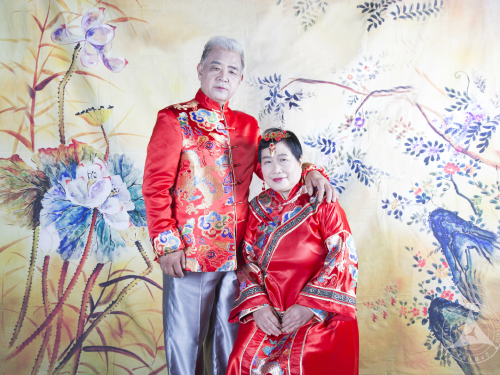 任爷爷和梁奶奶是同学们拍摄的第一对老人,奶奶亲和爱笑,爷爷严肃不太善言辞。后来在采访过程中梁奶奶告诉同学们:“爷爷不是不爱说话,2002年的时候因为得了脑出血压迫了神经说话有些受阻,腿脚也不是很利索。但不管如何十几年我还是一直坚持照顾他,因为就算儿女再孝顺,能陪在我身边的人还得是他。我知道他有些事都记在心里,不表达出来,他理解我,也知道我这么多年一直不容易,所以我们俩还是很幸福的。”奶奶段话虽然听上去很轻松,但是她这些年来付出的辛苦也是难也想象的。老两口喜欢旅行,这些年来他们一起去过韩国、泰国、厦门鼓浪屿、云南大理和丽江等等许多地方。这次的婚纱照拍摄正好赶上两个人结婚40周年,奶奶说不知道还有几个十年,年轻的时候根本没有这样的机会,趁着还能动来照一个,以后也不遗憾。