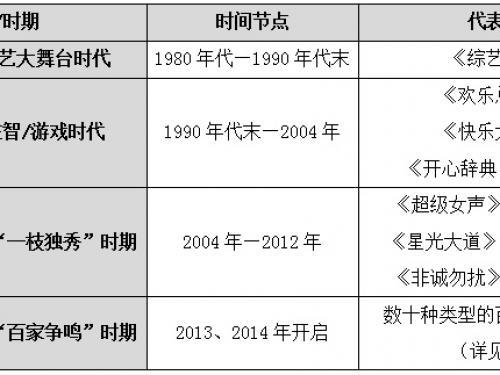 这些都让我们忽然感觉,从2013年开始,中国电视综艺娱乐节目(特别是其内容生产)扎扎实实地开启了自身发展的新阶段(见表1),主要表征是在广泛引进、购买海外成熟节目版权的基础上,以许多制作精良的“现象级”节目为代表,多元样态和类型的电视综艺娱乐节目突然集体“大爆发”式的出现,并主动而有效地引领了社会话题乃至流行文化生态,同时与国际流行的综艺娱乐节目多维接轨。中国综艺娱乐节目似乎开始走向裂变式发展之路,其创造力和活力是之前任何一个阶段所望尘莫及的,从整体开始摆脱自身发展的初级阶段。