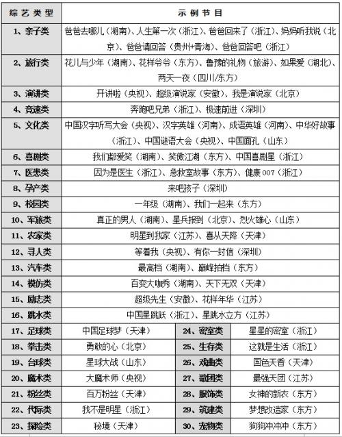 (注:关于表1对类别的划分,需要说明的是,综艺节目的类型划分不一而足,本表只是提供了一种方式,根据节目“内容”进行了较为细化的类型辨别。同时,为了突出新的节目内容与类型,本表也没有刻意对一些类型进行合并。此外,表中这些类别大致由两种划分体系进行了框定,一种是“行为”的问题,如旅行、演讲、探险、跳水等;一种是“主题”的问题,如亲子、文化、军旅、宠物等。)