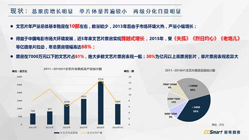 文艺片年产量总体基本稳定在10部左右,数量较少,2013年后由于市场环境火热,产量小幅增长。得益于中国电影市场大环境发展,近5年来文艺片票房实现跨越式增长,2015年,受《失孤》《烈日灼心》《老炮儿》等亿级单片拉动,年总票房增幅高达68%;