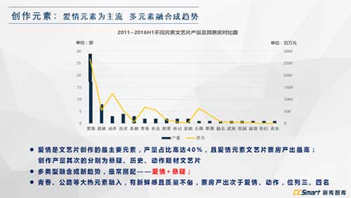 国内文艺片最主要的创作元素是爱情,产量占比高达40%,且爱情元素文艺片票房产出最高;创作产量其次的分别为悬疑、历史、动作题材文艺片。多类型融合成为近年来国产文艺片创作的新趋势,爱情加悬疑是最常出现的搭配组合。同时青春、公路等大热元素被融入文艺片创作,这些作品不仅具有新鲜感且质量不俗,票房产出次于爱情、动作,位列三、四名。