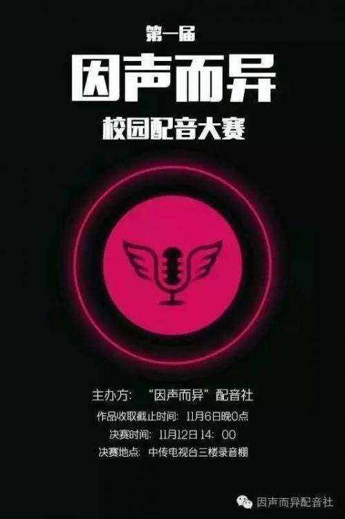 预赛:预赛选手提交配音秀app配音作品或者自制创意配音视频,将作品发送至邮箱495129304@qq.com(自制视频有技术上的问题,可联系因声而异配音社 ,他们将提供社团后期部门的同学给予技术支持),截止于11月6日。