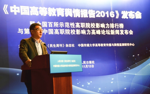 (通讯员 王保华)11月13日,由我校高教传播与舆情监测研究中心与人民日报《民生周刊》杂志社联合主办的“《中国高等教育舆情报告2016》暨全国百所示范性高职院校影响力排行榜与第一届中国高职院校影响力高峰论坛新闻发布会”在人民日报社举行。