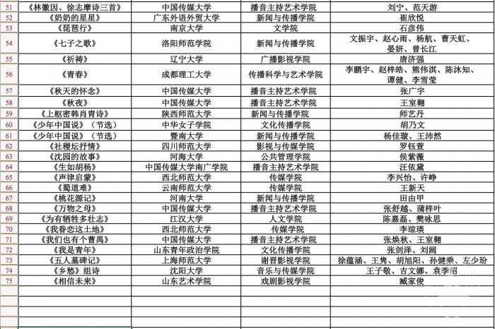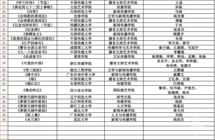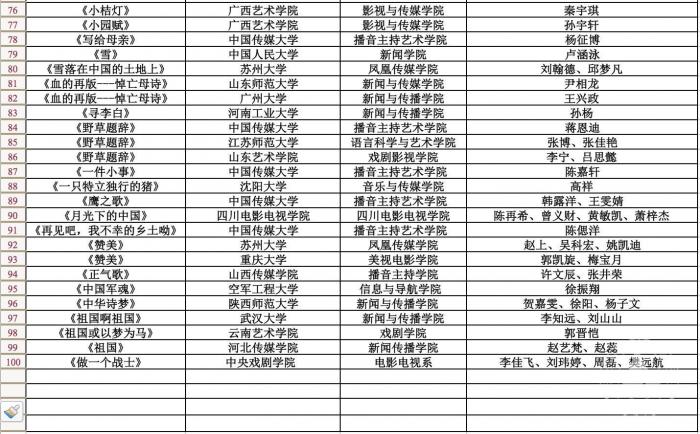 由中人民共和国教育部、国家言文字工作委会主管,教育部言文字用管理司、中国媒大学主,中国媒大学播音主持艺术学院承的第19越朗诵艺术节暨全国大学生朗大会——“华经诵读2017”工作已全部束,按照评审规则经过专评审,共有一百部作品入全国复,作品名如下: