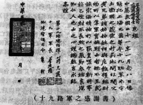 十九路军致广播电台之感谢书。原载《无线电问答汇刊》第19期(1932年10月10日出版)