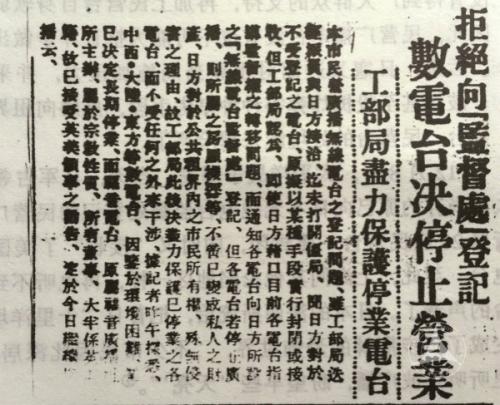 上海《新闻报》1938年5月3日关于民营台拒绝登记的报道
