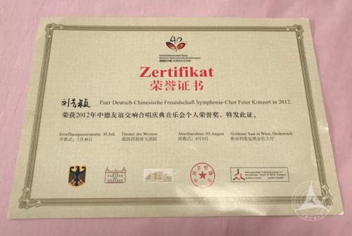中德建交40周年时赴德国西柏林大剧院、维也纳金色大厅比赛演出的优秀团员奖状