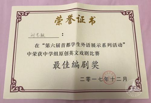 刘艺颖的性格大方有自信,初中的时候,她是学校的文艺部副部长,不仅组织了学校的戏剧节、还亲自改编和导演了《变色龙》这样的经典剧目,组织了学校的电影沙龙,也亲自参与拍摄了一系列的微电影。去年,她原创编剧和导演了一部学生舞台剧——《生日》,这部作品获得了“第六届首都学生外语展示系列活动——英文原创戏剧”最佳编剧奖和优秀剧目奖。