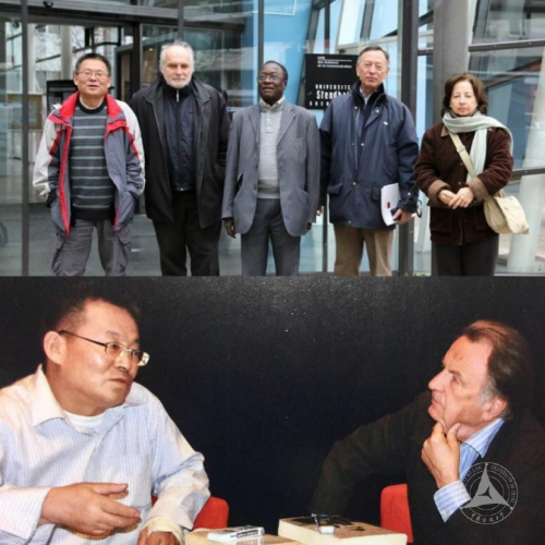 (上:担任司汤达大学国际学术评议委员会委员;下:与法国思想家德布雷交谈)