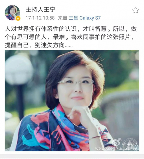 正如她自己所言,她是一个“热爱文学,热爱写作的人”,王宁喜欢用自己的笔触记录下生活的点滴,抒写对于人生的感悟。无论是2010年的随笔集《态度》,还是微博里温暖哲思的“宁姐鸡汤”,都是师姐对生活的描摹与体悟。她说,自己的阅读喜好越来越广泛,也越来越看到自己的边界与局限。“阿特伍德就是我文学上的偶像,我为她的《好骨头》而惊叹,为她的《别名格蕾丝》而折服。当我看毕飞宇的《玉米》时,我曾经有过这种感觉:‘这语言太奇妙了!语言还能以这样的形式排列、呈现出来!’”当看到这些美妙的文字时,她也曾感到自身渺小,“望洋而兴叹。”但最终却会想起毕飞宇曾对她说过的“即便是我们不了解物理,也不妨碍我们去享受《时间简史》带给我们的那种文字当中的享受。”很多东西并非一定要去拥有,“远远的看着它,就像看辉煌的古希腊文明一样,它曾经就在那里,它就在那里,你可以看到它,是你为人的幸运。”随着年龄增长,这些道理在她眼前渐渐明晰。“你会发现好书其实是有标准的,这个标准则是由你的阅历建构的。”