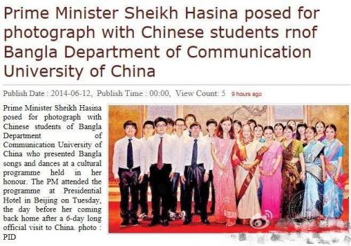 张潇予与学生一起接待孟加拉国总理谢赫·哈西娜访华并登上当地媒体头条