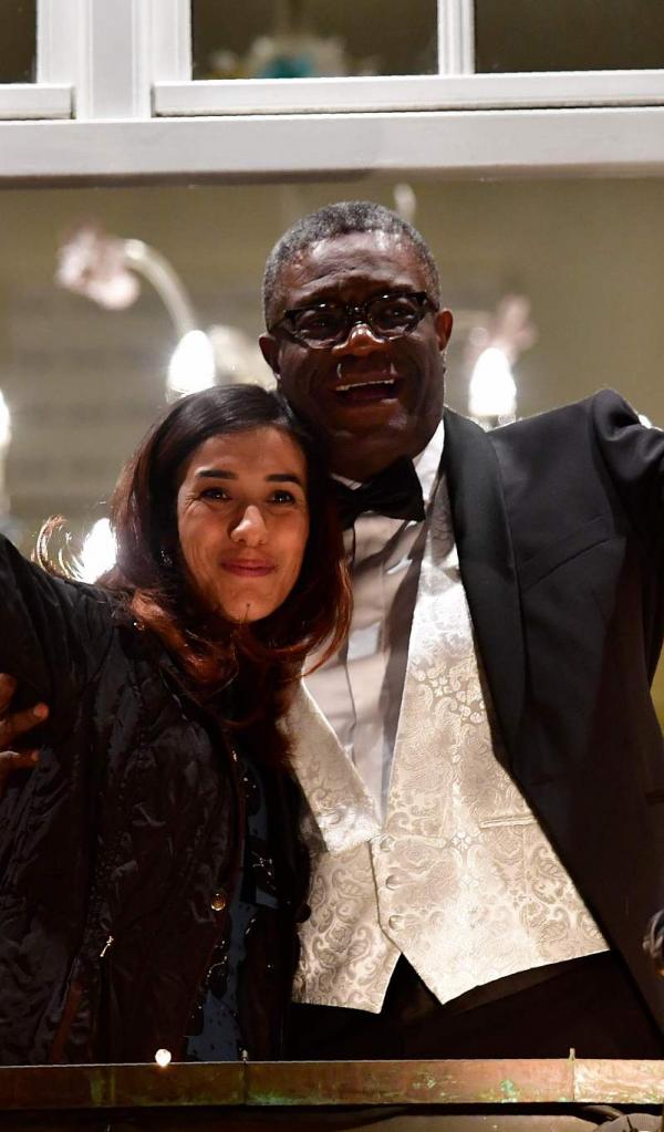 Nobel prize laureates Congolese gynecologist Denis Mukwege (R) and Iraqi Yazidi-Kurdish human rights activist Nadia Murad greet the crowd from the balcony of the Nobel suite in Oslo, Norway on December 10, 2018. /VCG Photo