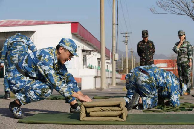 同学们进行内务训练和个人内务展示(中间被子为基地提供给的御寒被)