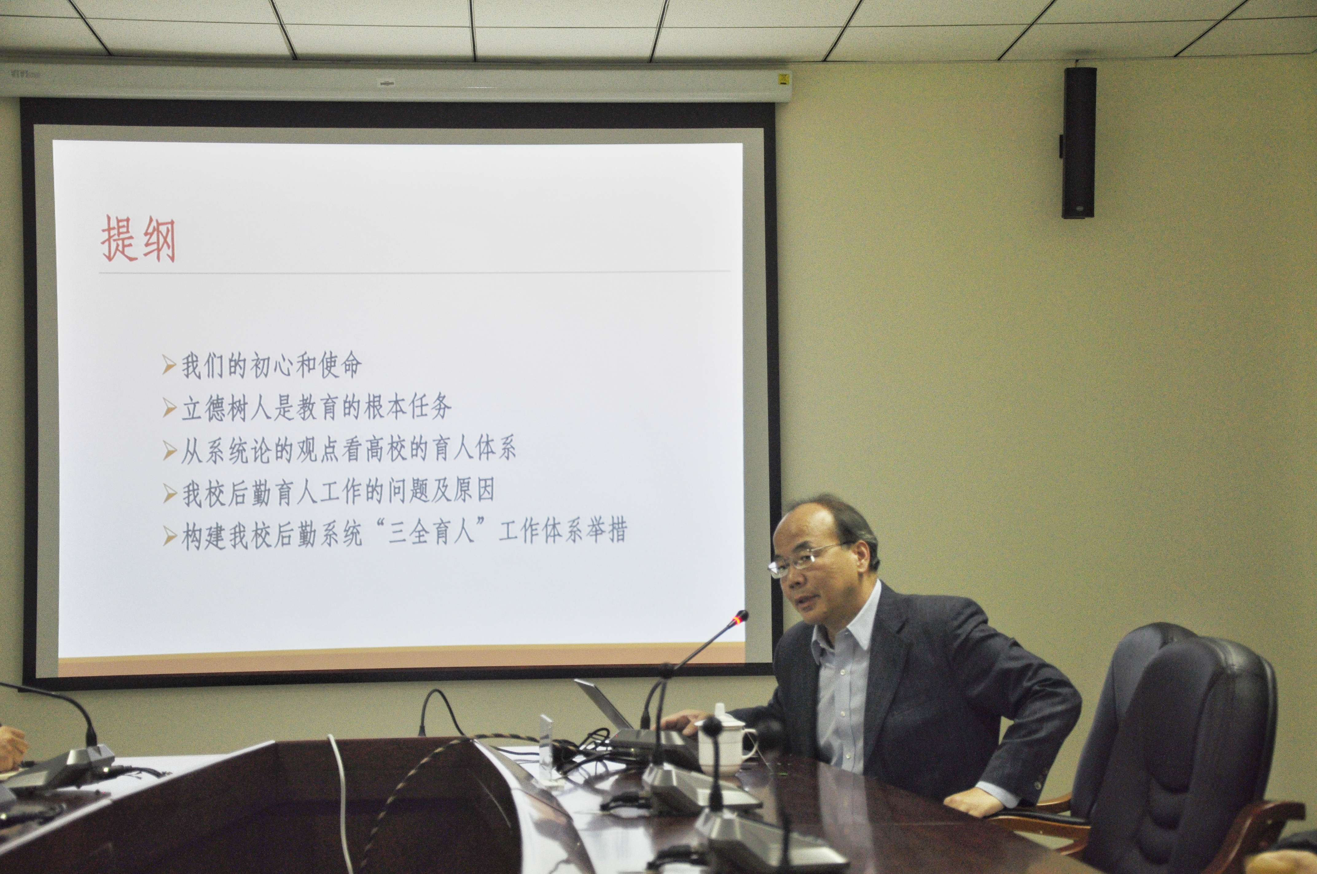 刘守训副校长从明确初心和使命、明确立德树人是教育的根本任务切入,从以系统论的观点看高校的育人体系、我校后勤育人工作存在的问题及原因、构建我校后勤系统“三全育人”工作体系举措等方面进行了详细的讲解。