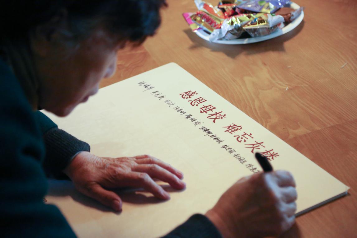 参观完校史馆,校友们回到梧桐书屋休息,并在“感恩母校,难忘灰楼”的返校纪念留言板上签字留念。