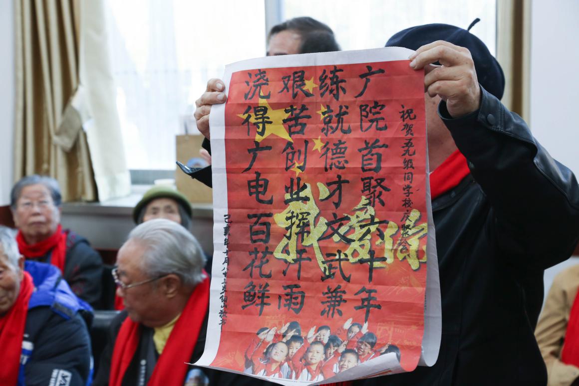 59级无线电系授课教师、广播学院原副院长周铜山表示,学校党委领导班子励精图治、奋发有为,在多媒体融合的时代,把几代广院人、中传人开辟的基业推向一个又一个新的高峰,为中传争光,为国家广播电视事业做出了奉献。老师回忆起灰楼时光,在一穷二白的条件下,先辈们带领大家白手起家,克服无数困难,经过几代人的奋斗才有了现在壮大、美丽、充满活力的大学。周老师也带来了亲笔题字“广院首聚六十年,练就德才文武兼。艰苦创业挥汗雨,浇得广电百花鲜”,以此祝贺59级无线电系校友校庆聚会。