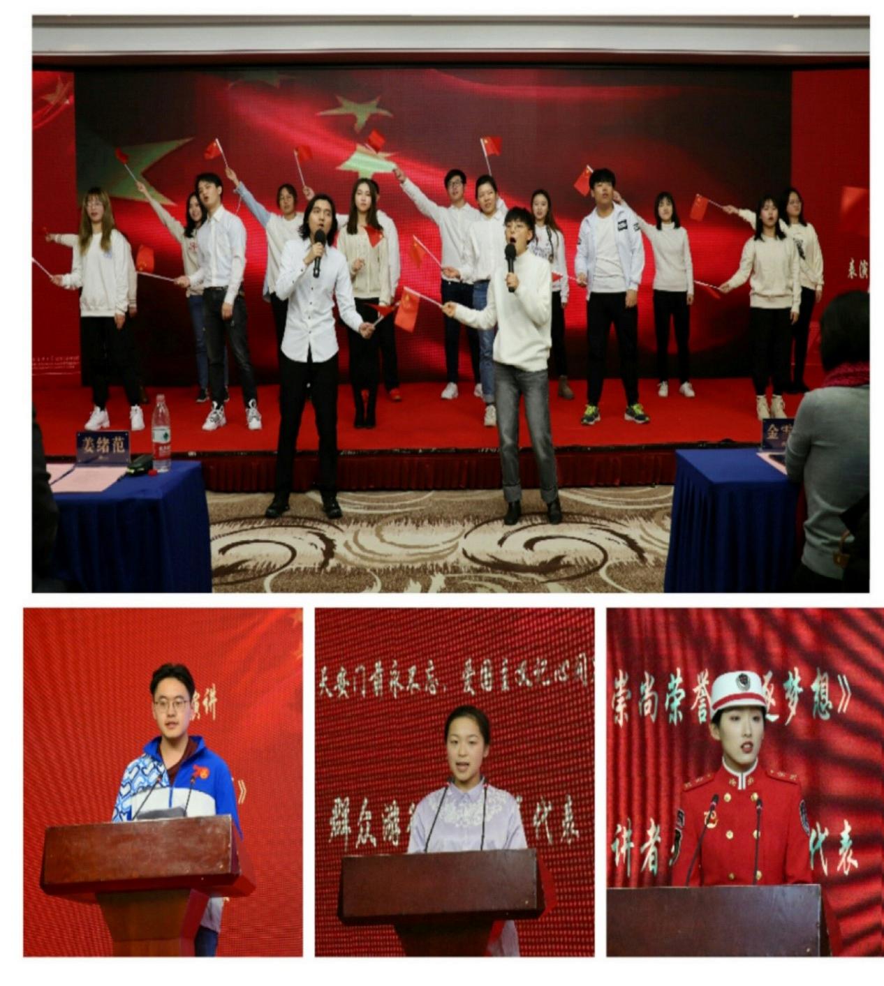 表彰大会现场,同学们用嘹亮的歌声和精彩的表演向祖国致敬。快闪表演《我和我的祖国》,国庆活动纪录短片《祖国万岁》,合唱表演《强军战歌》《红星歌》,一段段催人奋进的熟悉旋律将现场师生的爱国热情一次次点燃。