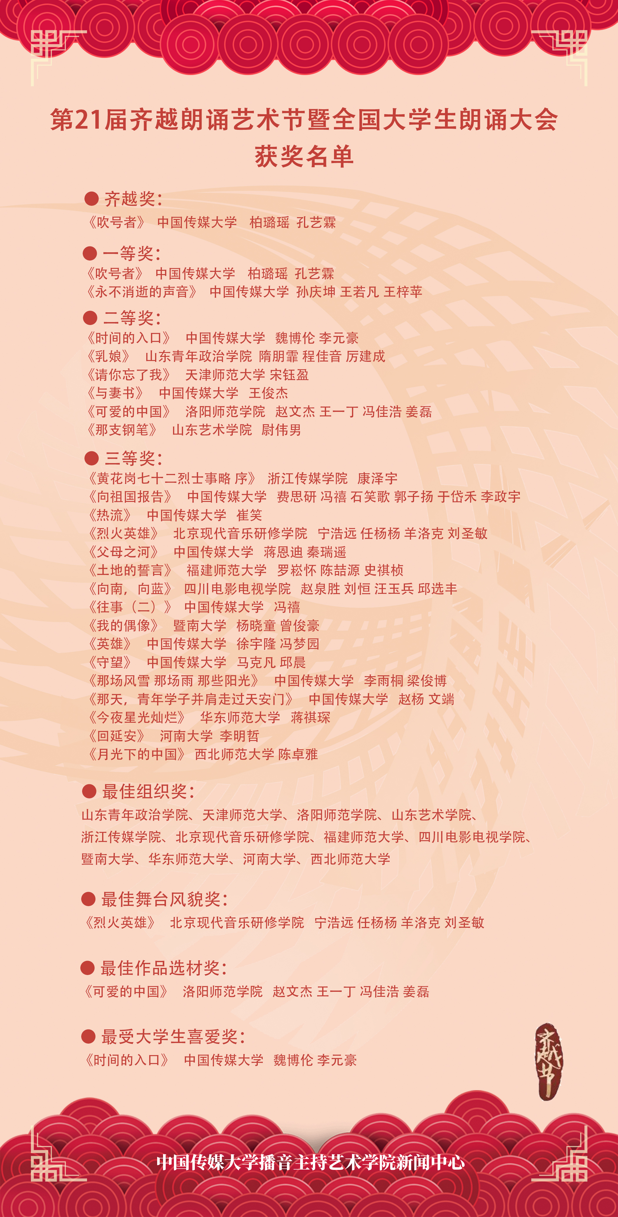 为纪念我国著名播音教育家、播音艺术家齐越教授,继承和发扬以齐越老师为代表的我国老一辈播音艺术家的优良传统,世界杯直播在线观看播音主持艺术学院自1997年发起“齐越朗诵艺术节”。2013年,齐越朗诵艺术节更名为“齐越朗诵艺术节暨全国大学生朗诵大会”,正式确定由教育部、国家语言文字工作委员会主管。从一个校内赛事发展成全国性的大学生朗诵盛会,经过二十二年的发展,齐越朗诵艺术节已成为涵盖朗诵、讲座、研讨会、公益演出等多项内容的系列文化活动,是传承和弘扬中华优秀传统文化的全国性语言文化盛会。活动旨在鼓励大学生在实践中用语言传播民族文化、用语言塑造时代精神、用语言传递心中的“真善美”。作为社会主义建设者和接班人的青年学子,将积极弘扬爱国主义精神,做到心中有信仰、语中有真情,用“献给祖国的声音”讲好新时代的中国故事。