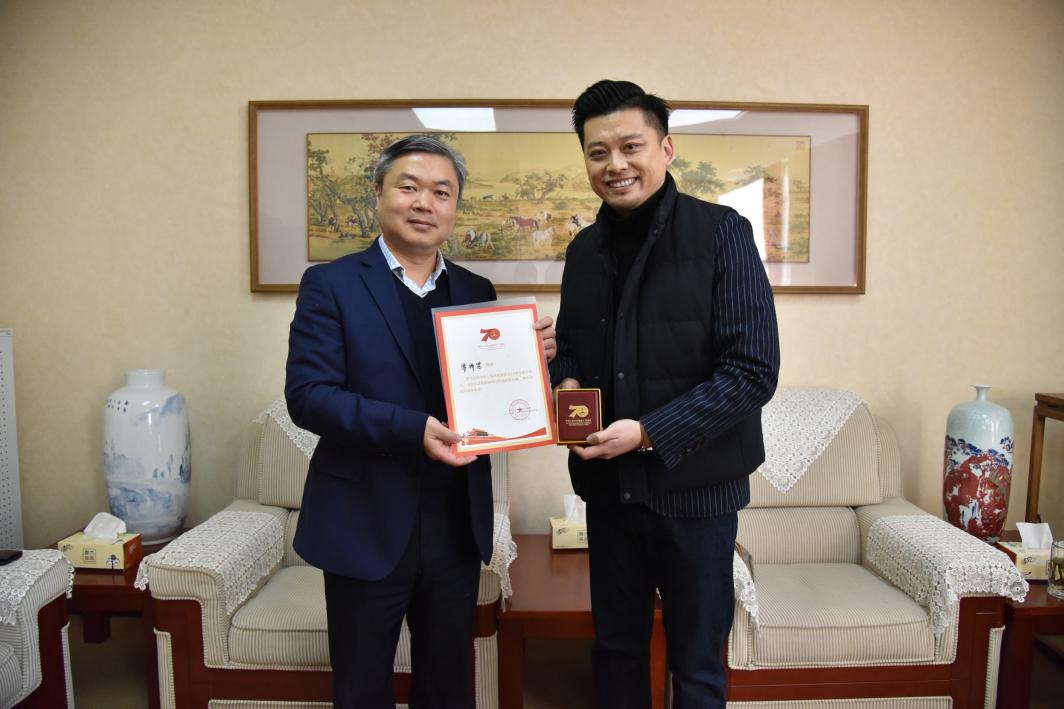 为表彰我校师生在庆祝中华人民共和国成立七十周年联欢活动主题表演区导演组工作中的突出贡献,北京市庆祝活动领导小组联欢活动指挥部特向我校颁发集体荣誉证书和个人荣誉证书。11月25日上午,联欢活动主题表演区运行总指挥、北京天启时代文化发展有限公司CEO杨光一行前往我校,送交了荣誉证书及纪念奖章。我校廖祥忠校长代表师生团队热情接待杨光导演一行。