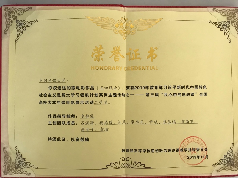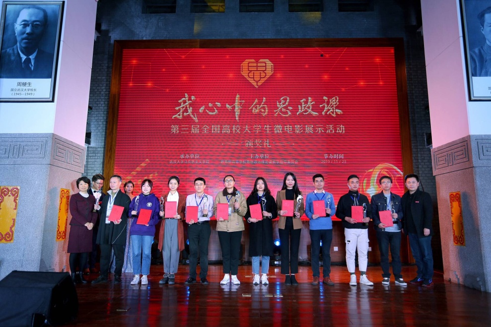 本届大赛共收到全国294所高校提交的325部作品,活动评选出特等奖5部、一等奖10部、二等奖20部、三等奖30部、优秀奖240部、单项奖4部及组织奖三个。我校选送的微电影《五四风云》荣获大赛二等奖。11月23日晚,第三届“我心中的思政课”全国高校大学生微电影展示活动颁奖礼在武汉大学举行。教育部社科司教学与出版处有关领导、湖北省教育厅思政与社科处处长赵耿、武汉大学副校长李斐出席了本次颁奖礼。