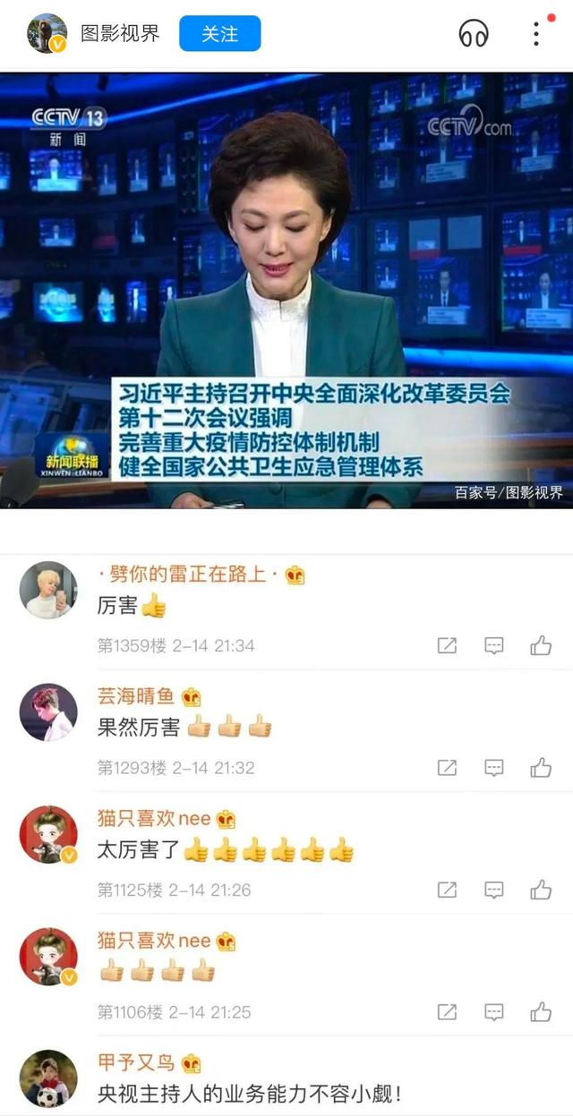 2018年,习近平总书记在全国宣传思想工作会议的讲话中指出:“做好新形势下宣传思想工作,必须自觉承担起举旗帜、聚民心、育新人、兴文化、展形象的使命任务。”自新冠肺炎疫情爆发以来,总台央视《新闻联播》节目多次延长播出时间,增加抗击新冠肺炎疫情报道内容,体现出主流媒体的职业使命与担当,业务能力更是得到了社会的广泛认可。2月12日央视《新闻联播》主持人李梓萌念稿8分钟无任何卡顿,新闻报道的专业功底获得了网友的认可,“李梓萌低头念稿”登上了微博热搜榜,2月14日主持人海霞播音12分钟无卡顿,再登微博热搜(“海霞低头念稿”),同时“央视girls”也一并登上热搜,以上三条热搜的微博总阅读量超过7亿人次。