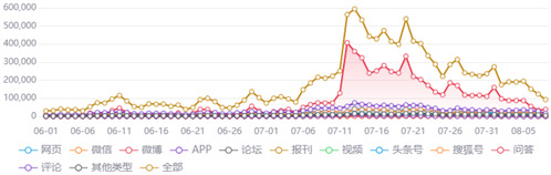 总体上,此次舆情分布可以划分为“小幅波动-大幅拉升-高位震荡-缓慢回落”四个阶段,6月1日至7月5日为小幅波动阶段,7月5日至7月13日为大幅拉升阶段,7月13日至7月21日为高位震荡阶段,7月21日后为缓慢回落阶段。此次舆情整体情感属性为正面、中心居多(总和近90%),存在一定负面情感(10%),情绪上赞扬占绝大多数(近70%),积极的情绪远多于消极的情绪。