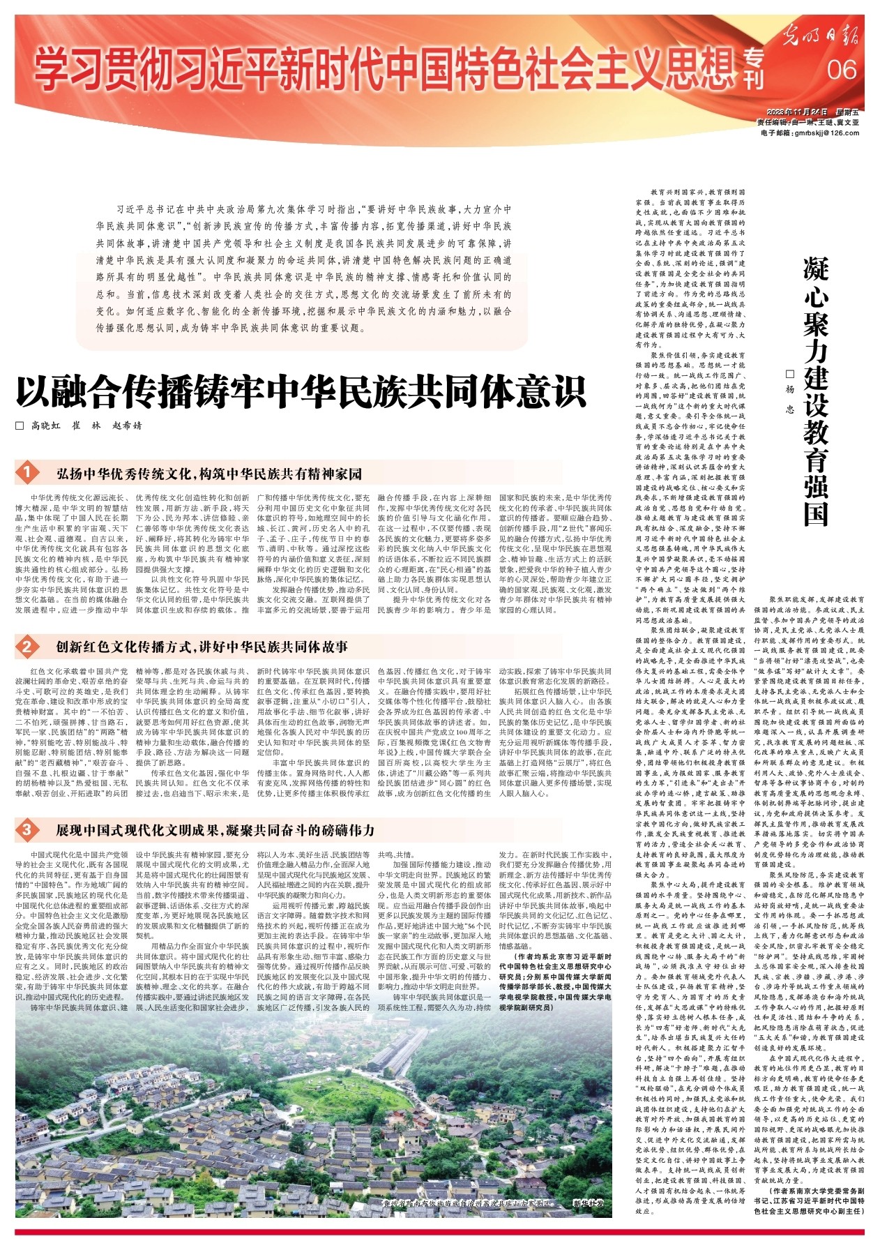 铸牢中华民族共同体意识是一项系统性工程,需要久久为功,持续发力。在新时代民族工作实践中,我们要充分发挥融合传播优势,用新理念、新方法传播好中华优秀传统文化、传承好红色基因、展示好中国式现代化成果,用新技术、新作品讲好中华民族共同体故事,唤起中华民族共同的文化记忆、红色记忆、时代记忆,不断夯实铸牢中华民族共同体意识的思想基础、文化基础、情感基础。
