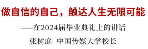 请大家相信,在中传的所有努力和收获,给予了你们自信的硬核实力。有句话说得好,鸟儿站在枝头,相信的从来都不是树枝,而是自己的翅膀。自信是中传人刻入骨血、代代相传的文化基因。你们在立德楼、博学楼用心上过的课,厚实了学术素养、提升了专业能力;你们在大阅城挑灯夜读,拓展了思考深度、开阔了眼界格局;你们在南操场挥汗如雨、在水立方畅游击水,强健了体魄、锻炼了意志;你们用脚步丈量祖国大地,深入了解国情、社情、民情,在实践中淬炼青春,强化了社会责任和使命担当。你们在中传洒下的汗水、付出的努力,早已为人生埋下了自信的种子、储备好了向上的力量。今天,请让它破土而出、为你赋能!