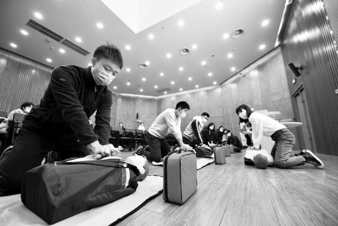 清华大学举办冬奥志愿者“心肺复苏及AED使用急救技能”培训,大学生志愿者们在专业医护人员指导下进行实操练习。北京晚报记者 和冠欣摄用眼神传递微笑、引导视障者坐立行走、参与一场冰球对抗赛……随着北京2022年冬...