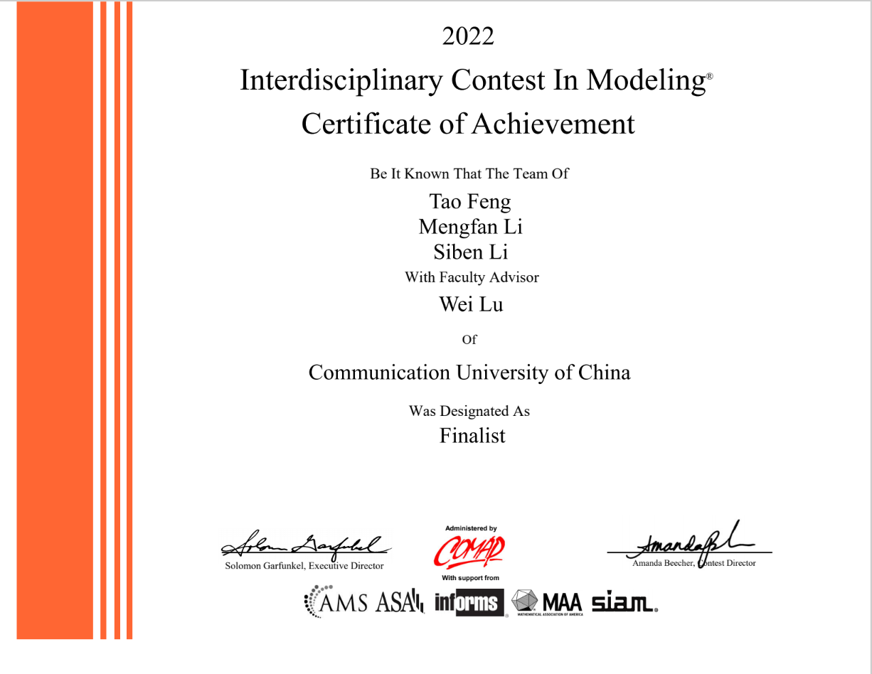 (通讯员 杨莉 王小宁)近日,2022年度美国国际大学生数学建模竞赛(MCM/ICM,下文简称“美赛”)获奖结果公布。我校数据科学与智能媒体学院2019级光电信息科学与工程专业冯涛、2019级大数据管理与应用专业李梦凡、2...
