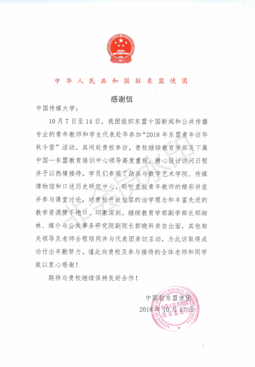 (通讯员:朱嘉)10月22日,中国驻东盟使团就“2018年东盟青年访华秋令营”来校参观访问一事,向我校致信表达感谢。此次活动是庆祝中国-东盟战略伙伴关系15周年开展的系列活动之一,由外交部亚洲司和中国驻东盟使团...