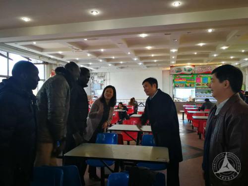 发展中国家留学生与校领导在食堂攀谈校园生活
