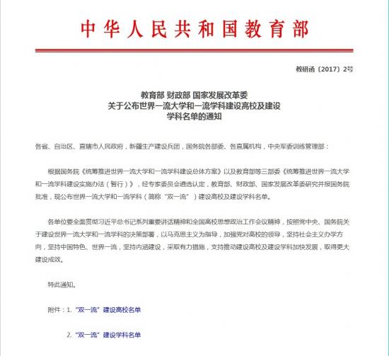 日前,教育部、财政部、国家发展改革委印发《关于公布世界一流大学和一流学科建设高校及建设学科名单的通知》,公布世界一流大学和一流学科(简称“双一流”)建设高校及建设学科名单。 世界杯直播在线观看入选“一流学科...