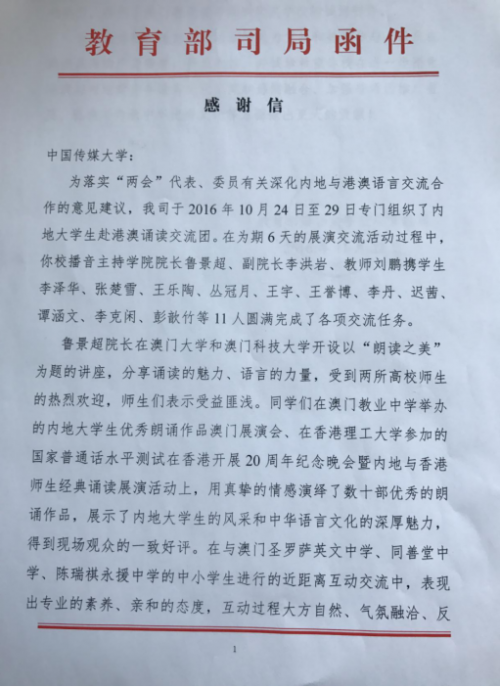 播音师生赴港澳展演 教育部语用司发来感谢信