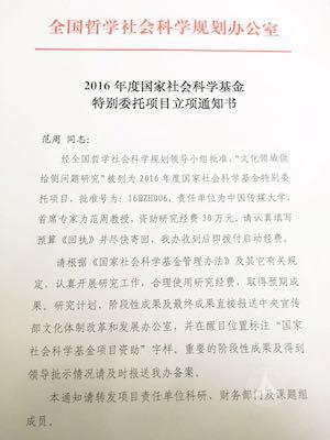 (通讯员 刘京晶)日前,经全国哲学社会科学规划领导小组办公室批准,由我校文化发展研究院范周教授作为首席专家开展的“文化领域供给侧问题研究”被列为2016年度国家社会科学基金特别委托项目(批准号为:16@ZH006...