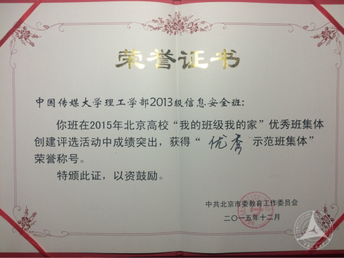 (通讯员 刘星妍)12月7日,由北京市教工委举办、北京工业大学承办的2015年北京高校“我的班级我的家”十佳示范班集体创建评选会,在北京工业大学逸夫图书馆一层报告厅举行。我校理工学部2013级信息安全班代表学校...