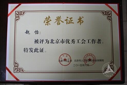 (通讯员 曹坤)经北京市教育工会系统推荐、北京市总工会等单位审核、公示等多个环节的评选,我校工会常务副主席赵怡同志近日荣获北京市总工会、北京市人力资源和社会保障局联合颁发的“2015年北京市优秀工会工作者...