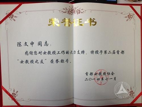 陈文申书记被授予首都“女教授之友”荣誉称号